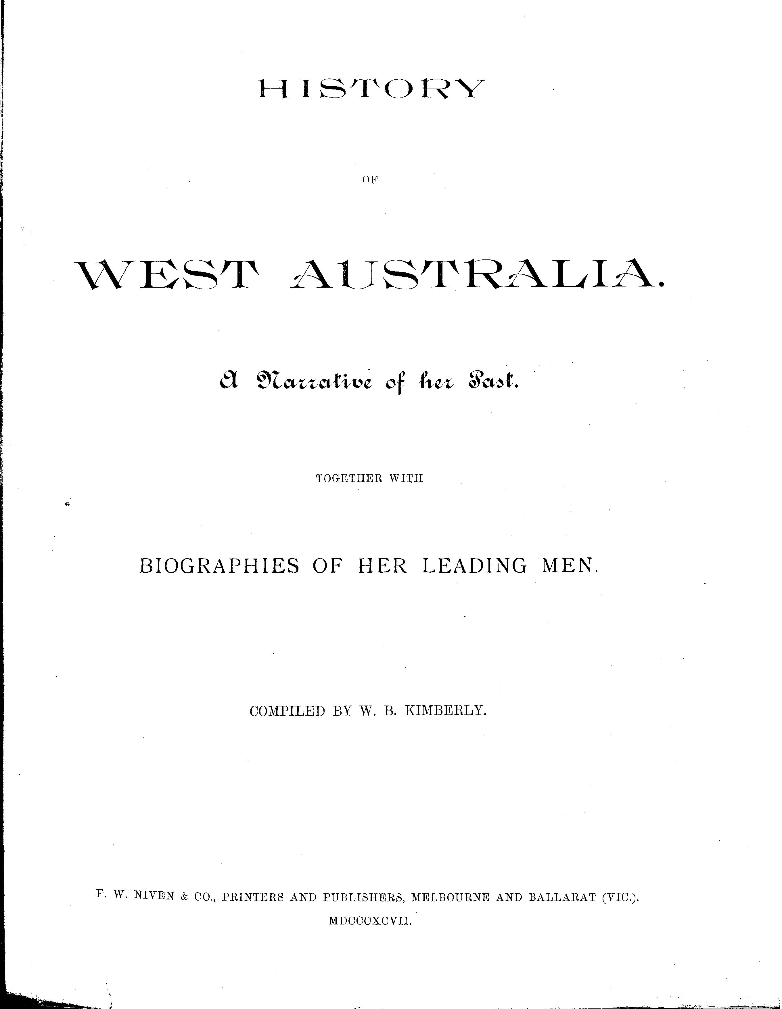 I have finished proofreading Mister Kimberly’s 1897 History of West Australia, or at least the first twenty-one main chapters. I fixed up a couple of hundred typographical errors in the Wikisource text.